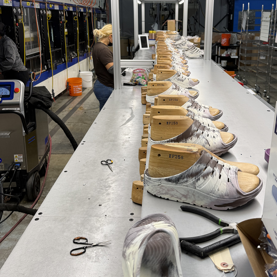 - Recycled and returned HEYLO-marked shoes are combined with USA-sourced injection molded EVA foam to create new Oka.