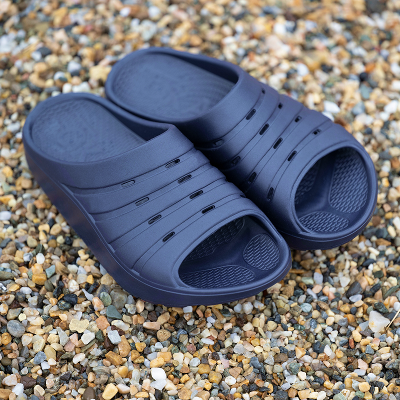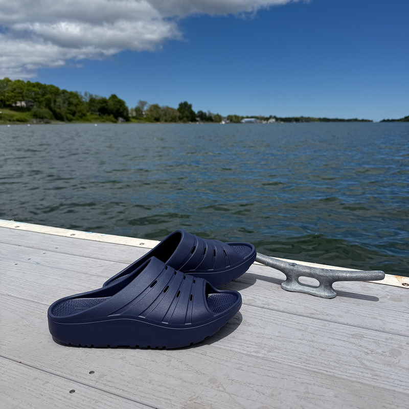Imagine your feet floating on gentle ocean waves...minus the sand in uncomfortable places. These navy recovery slides bring that weightless feeling with 35mm of buoyant foam, 12 cooling vents (sea breeze not included), and a wide upper that cradles without squeezing. For surfers, runners, or anyone who stands upright regularly.